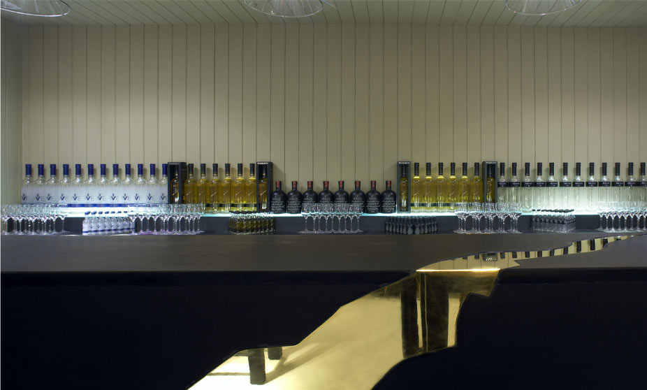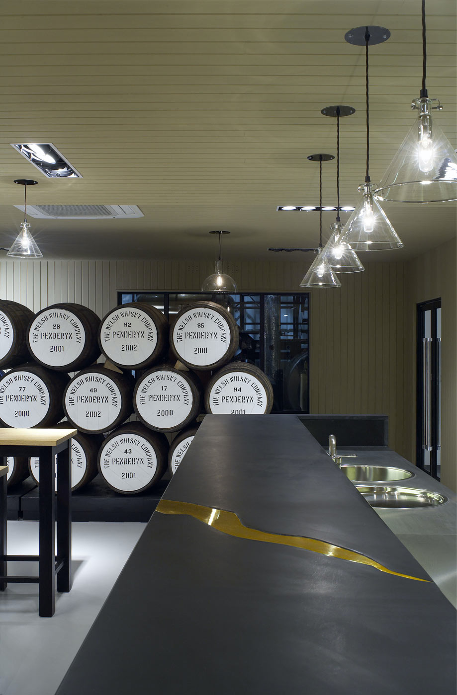 Whisky barrels and the Madeira casks, or barriques, used for the whisky’s final maturation, are incorporated into the interior design as a memory and reference point. Stacked to act as space dividers—guiding visitors through the space to a tasting bar—their monochromatic, cylindrical forms and graphic notations are a counterpoint to building’s austere organisation. The caskets add depth and rhythm to vertical walls and continue the refined use of timber in the interior spaces. The tasting bar is made of black Welsh slate with a gold seam inlay, displaying an array of visual ornamentation characterised by the whisky bottles filled with amber coloured ‘spirit’ . The design provides views from the tasting areas into the still, bottling area and cooperage store, allowing aromas to be drawn in, absorbing the rich bouquet from the whisky and sherry soaked casks used to add extra flavours during the ageing process.