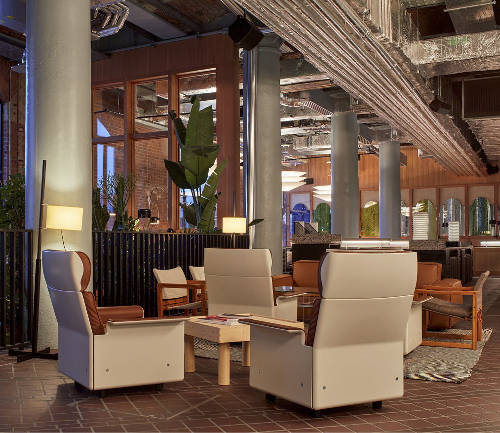 Already a triumph in Manchester, the architecture and interior design was intent on revealing the grandeur of the Victorian cotton warehouse embedded in the heritage of the rail and canal network, whilst layering the interior to reveal the cavernous space in isolated pockets. With a rich history, both nuanced and audacious it was important to find a human scale in the narrative with comfort. This was achieved in an architectural language that is reminiscent of a public library where you can have solace in the open plan whilst being part of the community ‘living room’- a ground floor social hub Includes an 80-seater restaurant, a Mini-Cini, coffee counter and flexible events and workspaces, providing a unique community centre and all-day hangout.