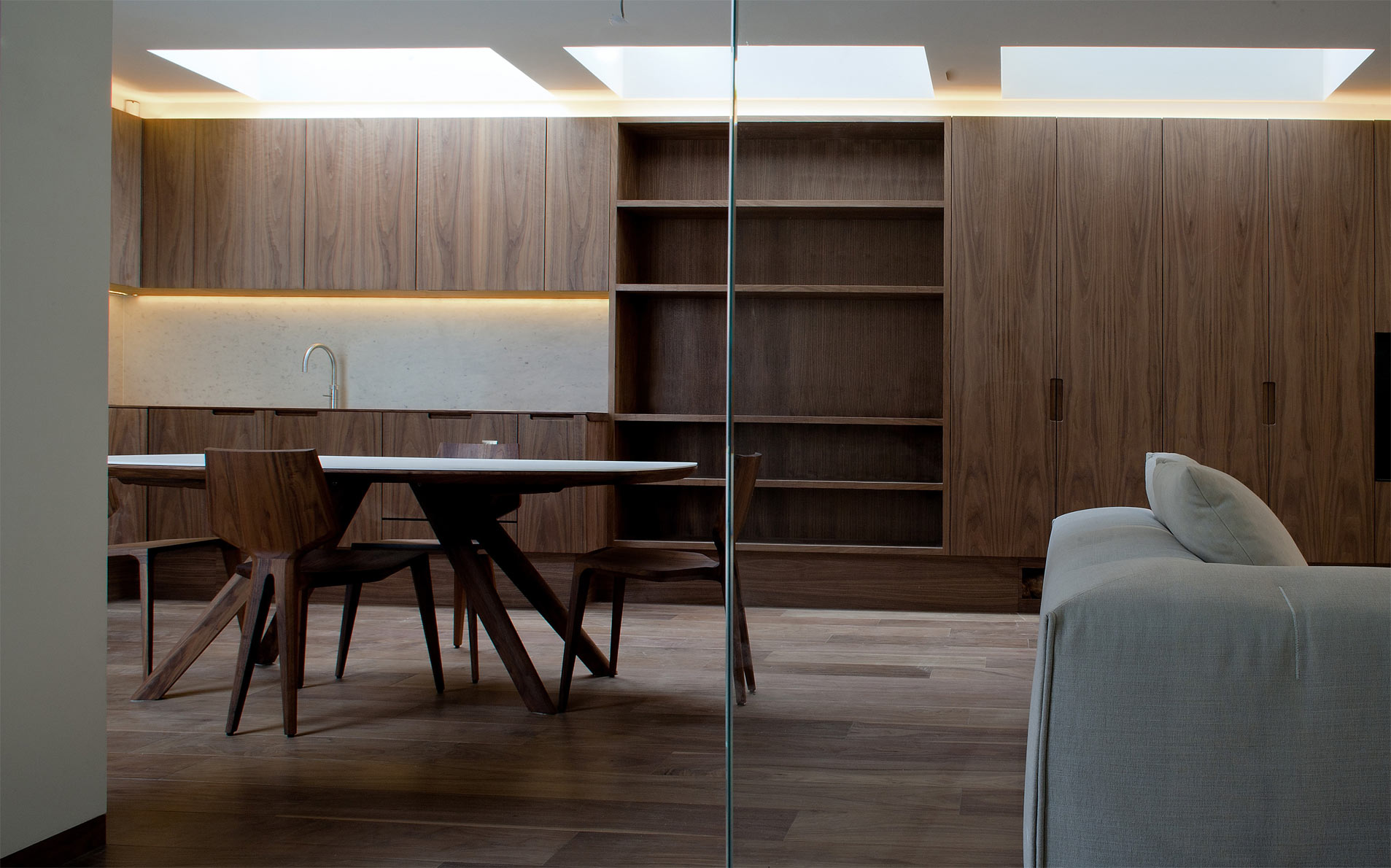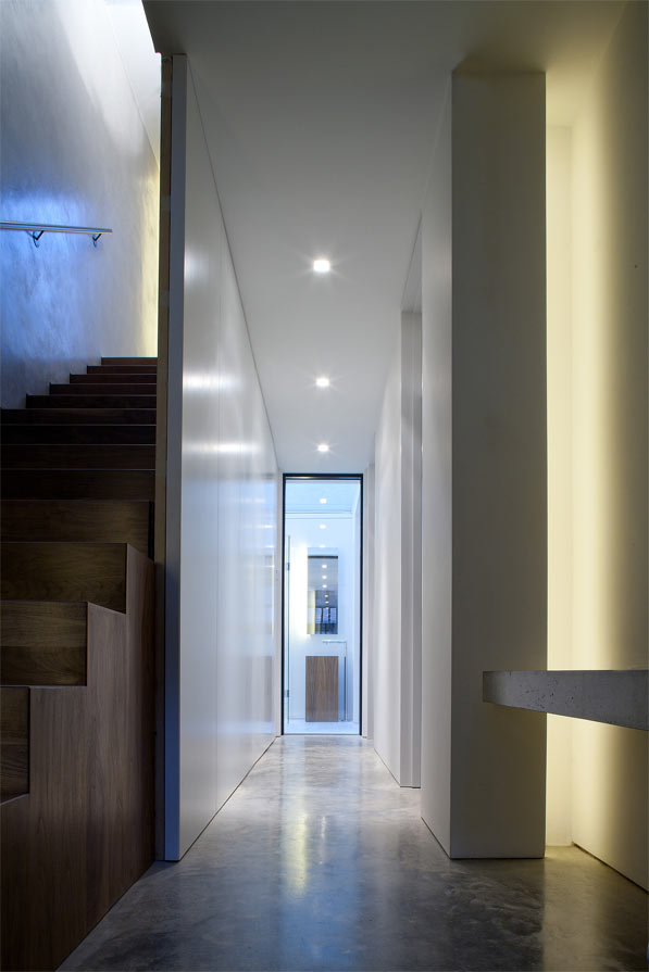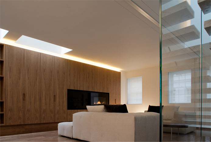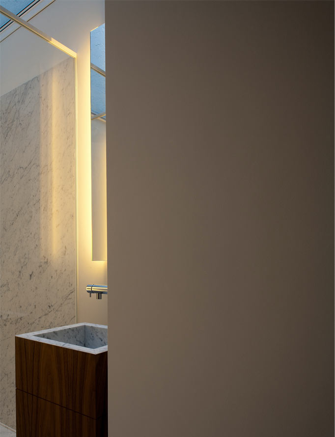 The original kitchen area was revitalised as a study and library and an open-plan kitchen was created at the heart of the house, providing a flexible environment for entertaining. The bathrooms were extended and reconfigured using Thassos marble, mosaics and coloured glass. The master bedroom is on the top floor and includes a bathroom enhanced by smoked glass and skylights to deepen the relaxation experience.