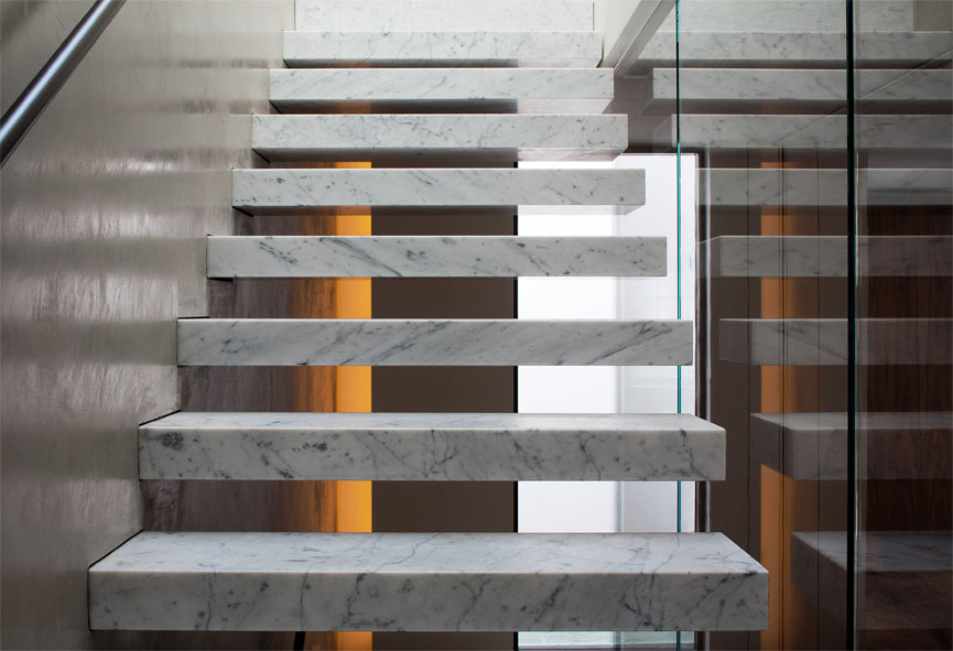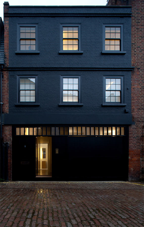 Archer Humphryes retained the character of the stable door mews façade, painting the brick a traditional London railings colour to enhance the picturesque Georgian street. The interior was remodelled within the constraints of the 18th century template. Mews houses generally have a singular aspect and it was important to top-light the property in order to filter light down through the house. A crucial intervention was made to cascade light into a newly created, three storey void. Within this, the architects introduced the scheme’s key feature, a cantilevered marble stair that hovers, without touching, against a glass wall separating the xx from the living space. This achieves the theatrical drama intended in the design, and helps to anchor the individual spaces arranged off it.