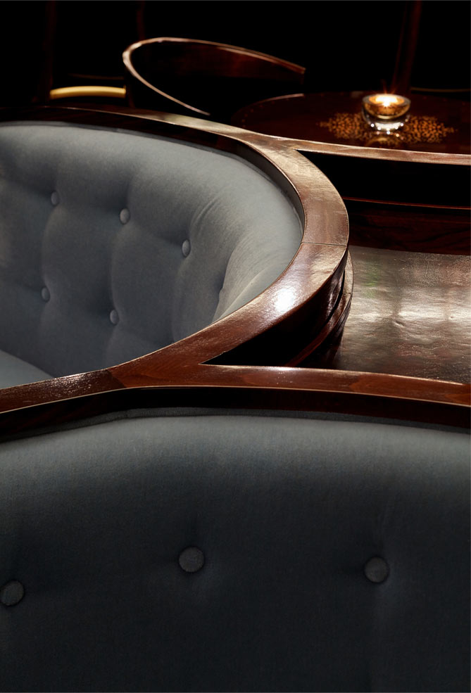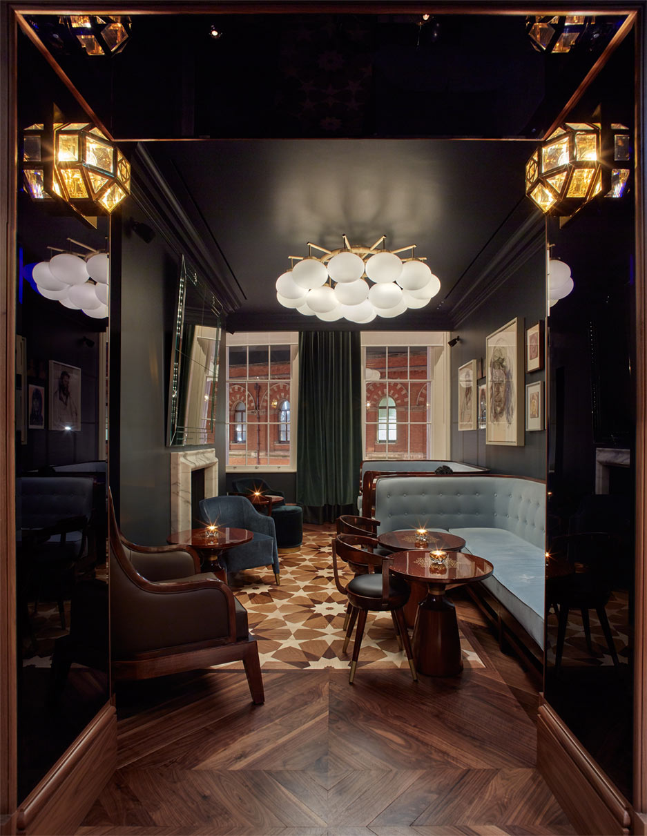 The challenge was to be the best chic bar and lounge in London. To create the concept for Anthracite Martini Lounge it required a timeless response that would blend and feel at home in the hotel. Evoking the style and glamour of the first railway age.- emphasising the historic character of the building while at the same time providing an elegant, contemporary design was the result. Starting with the entry space, the floor pattern in walnut, maple and oak was inspired by historical geometric patterns. The tessellation of stars on the floor provides a striking background that retreats in the hierarchy of the rooms, allowing other motifs- including the star sofa and bar to be prominent. When the furniture is occupied and the tables glistening with crystal and cocktails - the floor is the showcase. Interlaced with the geometry is the history of travel during the industrial revolution by train. Initially heading through the Simplon pass into Venice, then further afield to Istanbul, Syria and Iraq, Anthracite is an attempt to absorb the bygone era of the Belle Époque an overarching ambition for the hotel design concept.