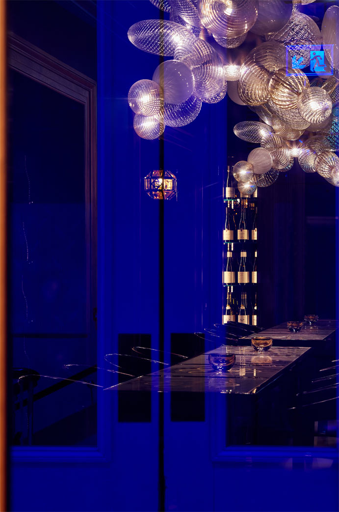 Main stand out features include: Quatrefoil high tables with marble inlay and traced brass: starfish central banquette designed in seafoam blue velvet: and opalescent Murano white spun glass chandeliers that form eye catching light to glaze over the interior.