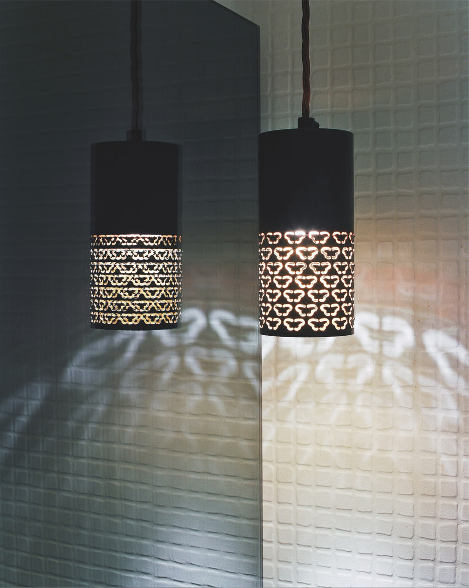 Natural sailcloth for the canopy stretches overhead suspended in the ‘air’, imitating the traditional rafts with their makeshift masts crossing the Mekong through the depth of the restaurant. The inspiration for the lighting design was the Candle Festival, which marks the start of Vassa in July in Ubon. Lighting designer Jonathan Cole made the pendant pieces for the architects. Having shared studio space with Archer Humphryes in the past, he was able to execute the designs in tandem with the evolution of the overall concept, which added dynamism to the lights—a prominent part of the scheme. Two pendant designs are predominant: one is small and focused in scale with patterns carefully cut into delicate folded black metal; the other is a frangible translucent parchment paper—a bright white Thai lantern. Both are adorned with a butterfly design that, within the metal pendant, creates a silhouette with beams of refracted light, spinning against the background walls. In contrast, the paper lanterns create an ambient stream of light, softly radiating. Butterflies often represent rebirth in artistic symbolism; the butterfly was the only ornamentation that Archer Humphryes introduced within the otherwise modern interior.