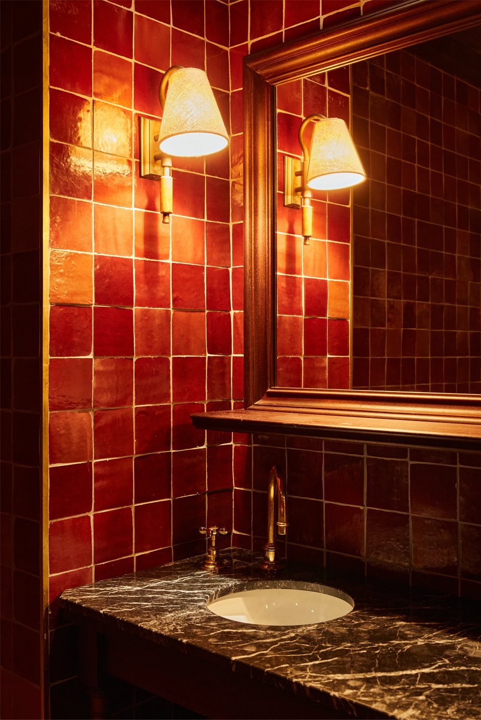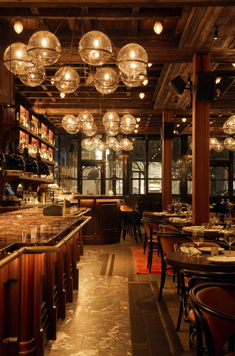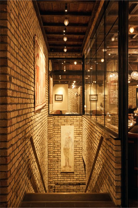 Within the dining room, full of activity, atmosphere and the appetising scent of meals being prepared, the floor is laid in brick, the ceilings are finished in sawn timber and the walls are of exposed London stock brick. The liquor bar sits in the street window; illuminated in the evening, it draws in guests and passers-by who can either have a drink, enjoy the wine list or order from the menu.